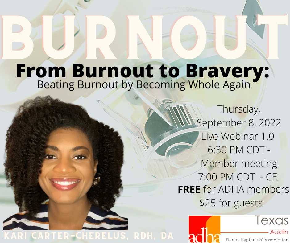 Sept 22 CE – Burnout promo August 11, 2022 940 × 788 Continuing Education Photo of Kari Carter-Cherelus over picture of overhead light. Details of event listed date September 8th, time 6:30PM central, and price Free for ADHA members, 25 US dollars for guests. Provided by Greater Austin Dental Hygienists’ Association Like Loading...