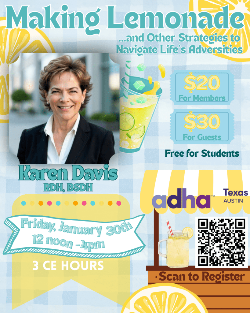 Course Description: Life, and dentistry itself, are a tapestry of rewards and challenges, but some challenges become life-altering. How do we wear our professional hat while simultaneously grieving, struggling with unexpected life challenges or heartache? Why are some people better lemonade-makers from the lemons of life? Within the family of dentistry, most of us have faced, or will face significant set-backs and difficulties. What are effective strategies to navigate life’s challenges? What can be gleaned from those in the business of not only making lemonade, but benefitting from it? This lemonade recipe may surprise you.